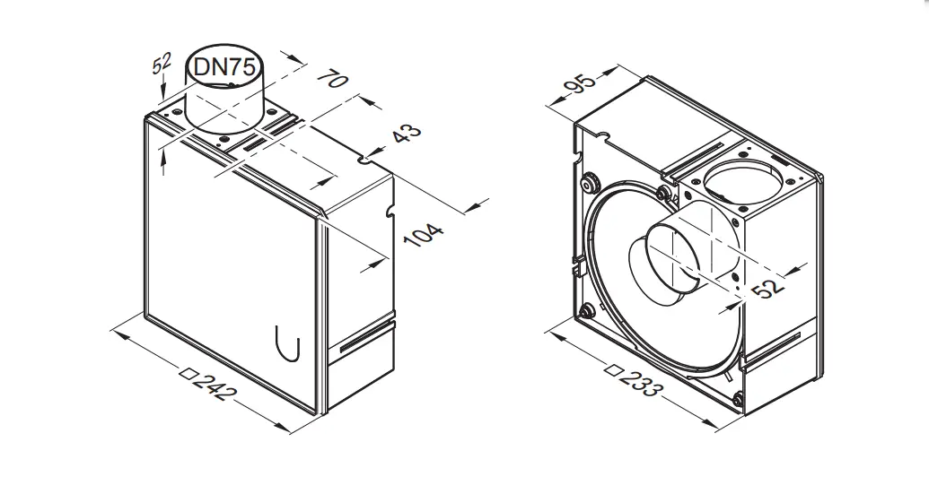 Корпус монтується в або на стіну і далі до нього підключається вентиляторний блок, який розміщується в корпусі. Потім кріпиться зовнішня декоративна кришка.