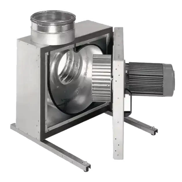 Оснащений однофазним двигуном із зовнішнім ротором і крильчаткою з загнутими вперед лопатями, встановленими на заглушку. Продуктивність можна регулювати зовнішнім п'ятиступінчастим трансформатором, є можливість підключити термореле для теплового захисту.