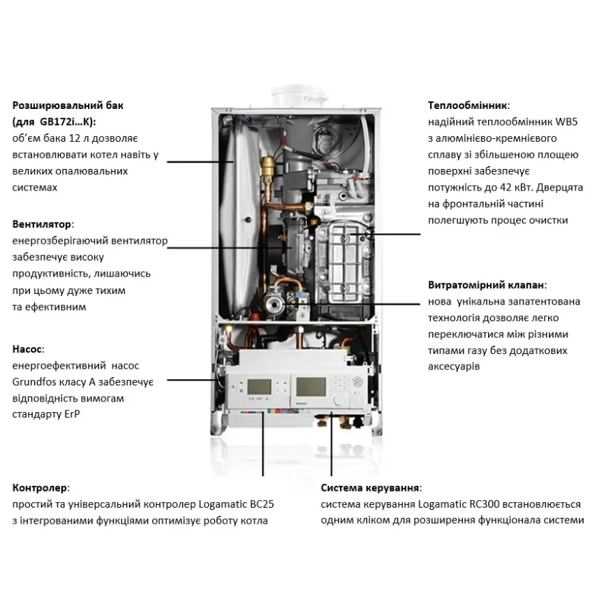 Котёл оснащён контроллером Logamatic BC25, который обеспечивает стабильную и надёжную работу системы отопления.