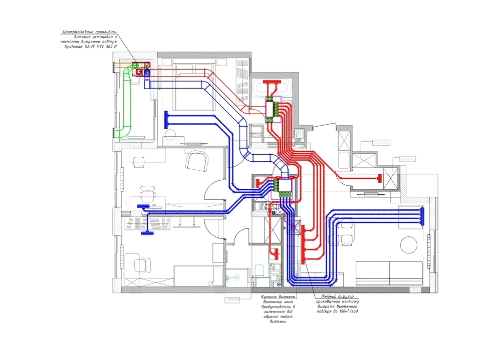 Нижче ви можете побачити схему пристрою припливно-витяжної системи для будинку з рекуперацією тепла.